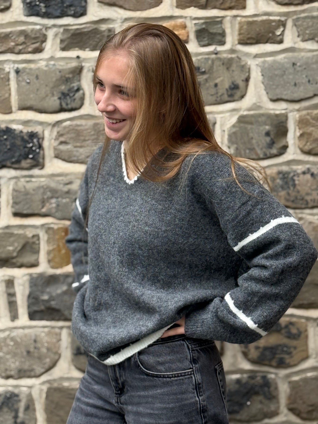 Le col en V bordé de blanc et les petites bandes contrastées sur les manches ajoutent une touche soignée et féminine.