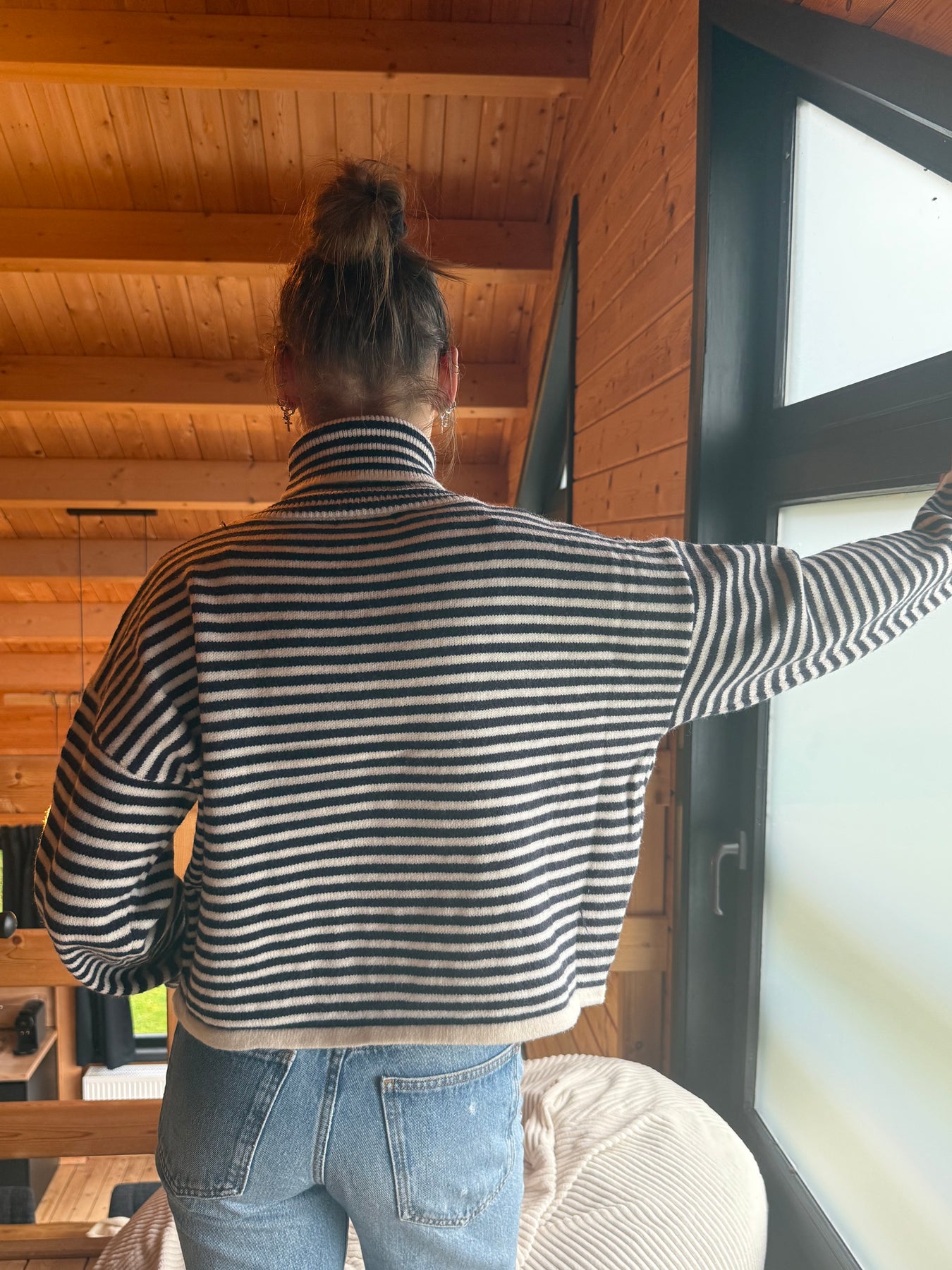 Sa maille douce et son col montant en font un indispensable pour les journées fraîches, tandis que ses rayures marine et écrues rappellent l’élégance intemporelle du style marin.
