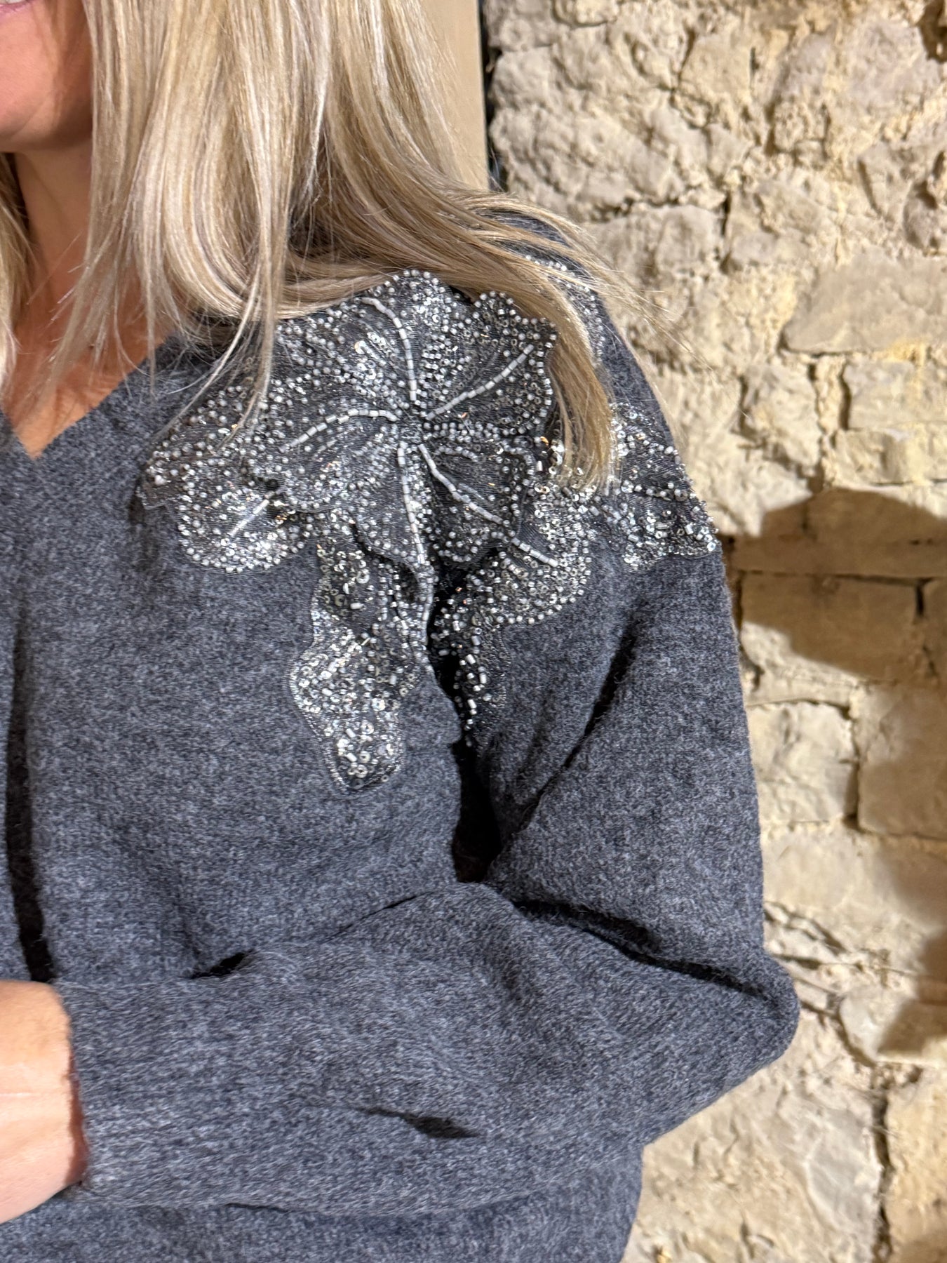 Ce pull en maille gris perle combine douceur et sophistication avec son détail brodé sur l’épaule. Les perles et sequins forment une délicate fleur qui apporte une touche lumineuse et féminine, sans jamais être trop voyante.